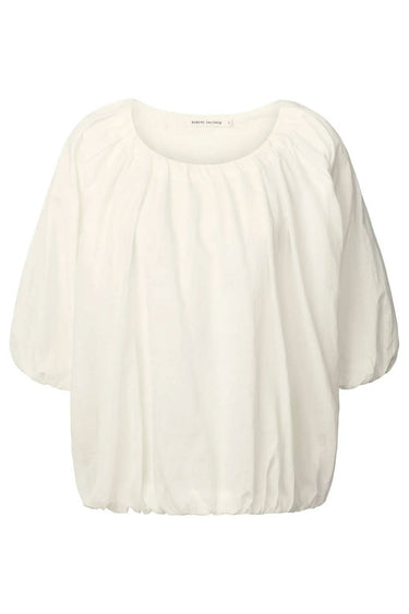 OBS! Fjernlager. Levering kan blive forlænget med 2-3 dage, hvis varen ikke findes i vores butik lige nu.Elegant bluse fra Rabens Saloner med ½ lange pufærmer, bådudskæring i halsen og smukke læg over brystet.