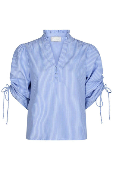 OBS! Fjernlager. Levering kan blive forlænget med 2-3 dage, hvis varen ikke findes i vores butik lige nu.Feminin bluse fra Neo Noir med ¾ lange ærmer med bindesnore, v-udskæring med en lille flæsekant i halsen og et klassisk stribet print.