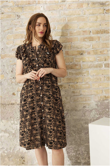 - OBS! Fjernlager. Levering kan blive forlænget med 2-3 dage, hvis varen ikke findes i vores butik lige nu.Sød kjole fra In Front med korte ærmer, v-udskæring i halsen og knaplukning langs fronten. Kjolen har også stiklommer i siderne og skønne flæser over brystet og skulderne.