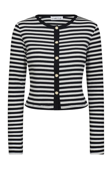 - OBS! Fjernlager\nLeveringen kan blive forlænget med 1-2 dage, hvis varen ikke er at finde i vores butik lige nu.\n\nModel Rib Striped Crop Cardigan L/S SHIRT HL10028 Black Stripe\n\n95% COTTON, 5% ELASTANE