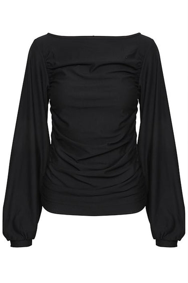 Elegant bluse fra Gestuz med lange pufærmer, en bred halsudskæring og de flotteste draperet effekter der giver den et feminint udtryk.