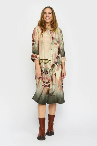 OBS! Fjernlager. Levering kan blive forlænget med 2-3 dage, hvis varen ikke findes i vores butik lige nu.Super flot kjole fra 2-Biz med ¾ lange ærmer, kinakrave i halsen og et smukt print.Kjolen har også en afslappet silhuet og knaplukning langs fronten.