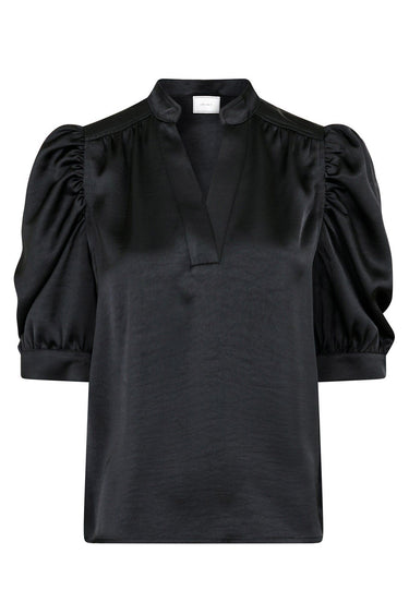 Feminin bluse fra Neo Noir med korte pufærmer, v-udskæring i halsen og en smuk satin kvalitet.