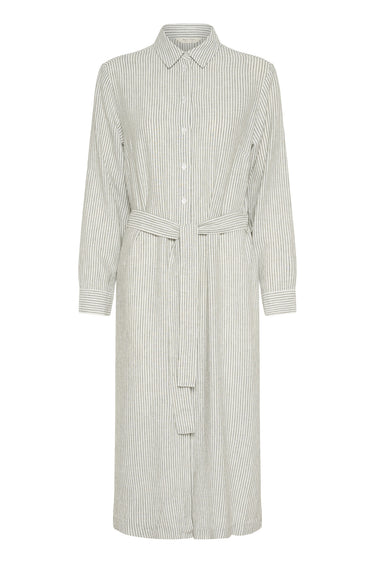OBS! Fjernlager. Levering kan blive forlænget med 2-3 dage, hvis varen ikke findes i vores butik lige nu.Fin enkel skjortekjole fra Part Two med lange ærmer, krave i halsen og et klassisk stribet print. Kjolen lukkes med små knapper langs fronten og kommer også med et bredt bindebånd til taljen.