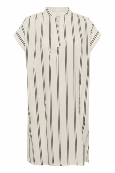 OBS! Fjernlager. Levering kan blive forlænget med 2-3 dage, hvis varen ikke findes i vores butik lige nu.Smart skjortekjole fra Part Two med korte ærmer, kinakrave med v-udskæring i halsen samt en afslappet silhuet og et klassisk stribet print.
