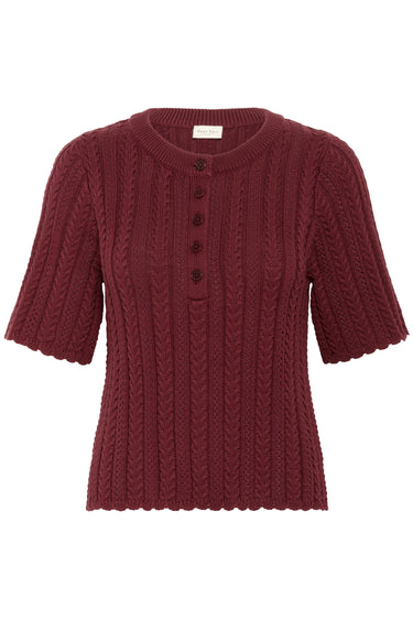 OBS! Fjernlager. Levering kan blive forlænget med 2-3 dage, hvis varen ikke findes i vores butik lige nu.Feminin strik fra Part Two med korte ærmer, rund hals og et kort knappanel over brystet.Strikken har også en fin silhuet og et super flot mønster.