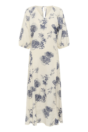 OBS! Fjernlager. Levering kan blive forlænget med 2-3 dage, hvis varen ikke findes i vores butik lige nu.Feminin kjole fra Part Two med ½ lange pufærmer, v-udskæring i halsen med et lille bindebånd i nakken og et super fint print.