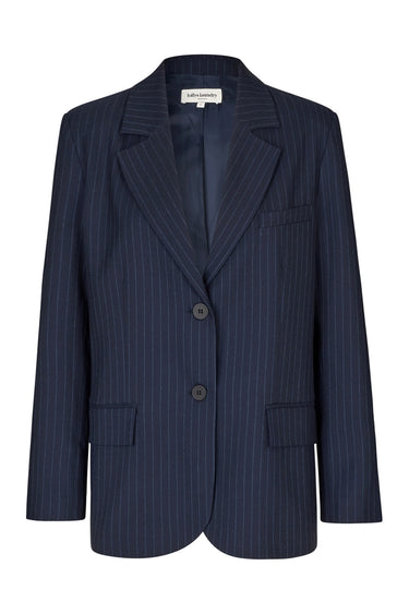 OBS! Fjernlager. Levering kan blive forlænget med 2-3 dage, hvis varen ikke findes i vores butik lige nu.Flot mørk marineblå blazer fra Lollys Laundry med elegante nålestriber – en tidløs tilføjelse til din garderobe. Den har en let overdimensioneret silhuet, en to-knaps frontlukning, klaplommer foran, en brystlomme og manchetter med knapper.