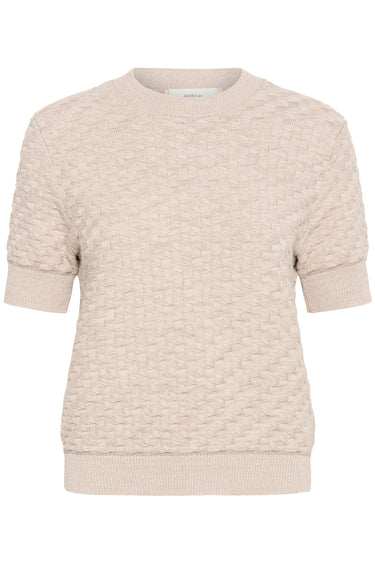 OBS! Fjernlager. Levering kan blive forlænget med 2-3 dage, hvis varen ikke findes i vores butik lige nu.Sød strik fra InWear med korte ærmer, rund hals og brede ribkanter.Strikken har også et fint mønster og en afslappet silhuet.