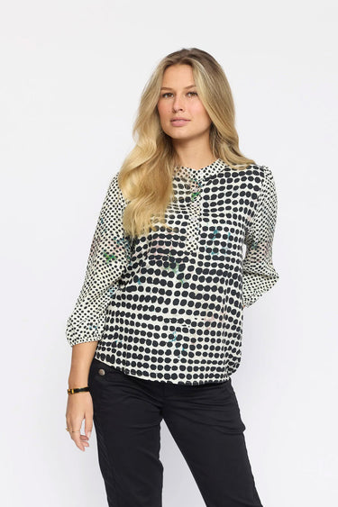 - Flot bluse fra 2-Biz med ¾ lange ærmer, rund hals med v-udskæring samt et skønt prikket print.
