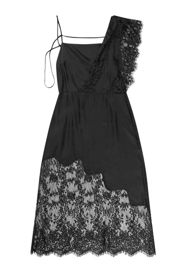 OBS! Fjernlager. Levering kan blive forlænget med 2-3 dage, hvis varen ikke findes i vores butik lige nu.En smuk, detaljeret kjole fra Munthe med elegante blonde applikationer og en fin snor detalje ved bryst og skulder. Kjolen har en asymmetrisk blonde finish nederst.