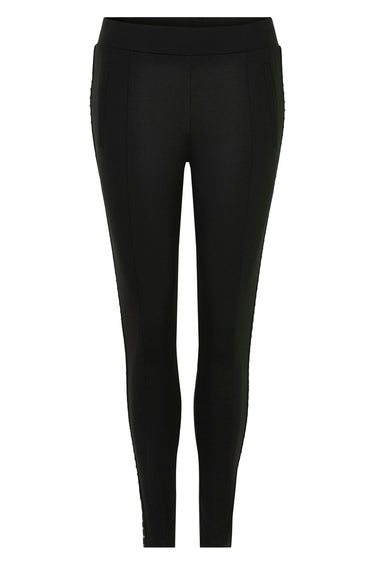 Leggings fra In Front med lodrette snydelommer foran. Leggingsene er lavet i et elastisk materiale hvilket gør at i sidder meget behagelige og yderligere er de dekoreret med nitter ned langs begge bukseben.- Pasform: Tætsiddende