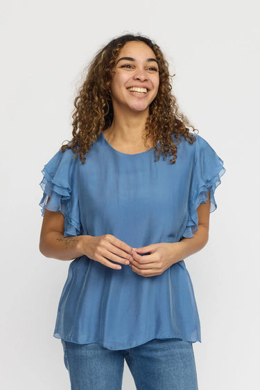 OBS! Fjernlager. Levering kan blive forlænget med 2-3 dage, hvis varen ikke findes i vores butik lige nu.Feminin bluse fra 2-Biz med bådudskæring i halsen og smukke flæseærmer.
