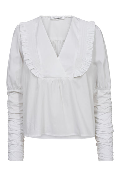 OBS! Fjernlager. Levering kan blive forlænget med 2-3 dage, hvis varen ikke findes i vores butik lige nu.Flot bluse fra Co'couture med lange ærmer, v-udskæring og skønne detaljer med fine flæser over skulderne og brystet samt smarte rynkeeffekter langs ærmerne.