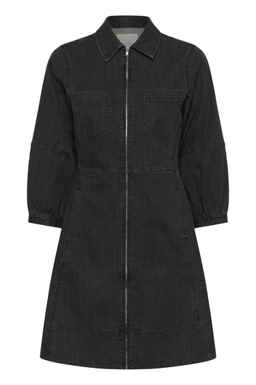 OBS! Fjernlager. Levering kan blive forlænget med 2-3 dage, hvis varen ikke findes i vores butik lige nu.Smart denim kjole fra Part Two med ¾ lange ærmer, en lille krave i halsen og lynlåslukning langs fronten.