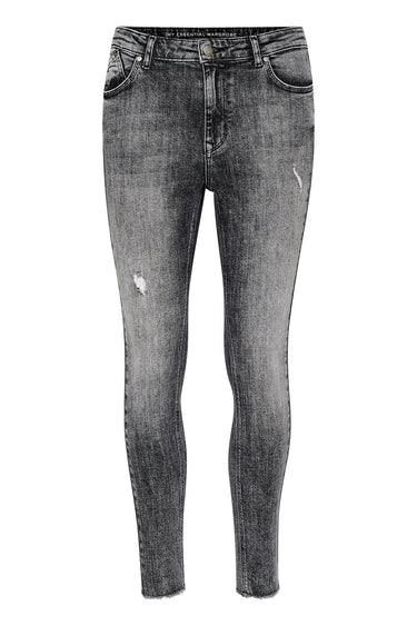 OBS! Fjernlager. Levering kan blive forlænget med 2-3 dage, hvis varen ikke findes i vores butik lige nu.Smarte jeans fra My Essential Wardrobe med en high-rise talje, en cool grå vask og en slim-fit pasform.Bukserne har også en moderne 7/8 længde og små slidte effekter der giver dem et råt udtryk.