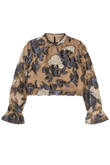 En cropped bluse fra Munthe med et elegant paillet blomster mønster, og perle detaljer langs ærmer, ryg og hals. Denne bluse er designet med en smuk slids og knaplukning på ryggen.