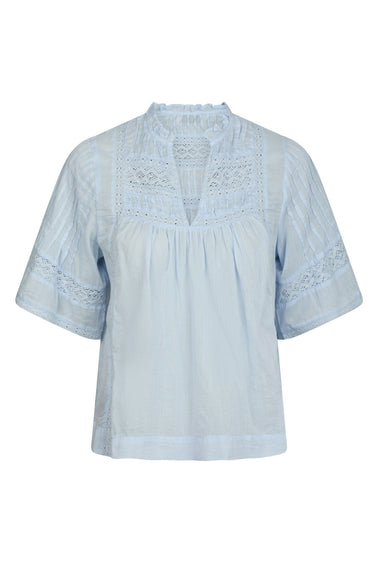 Feminin bluse fra Neo Noir med ½ lange flæseærmer, rund hals med v-udskæring og de smukkeste broderet detaljer.