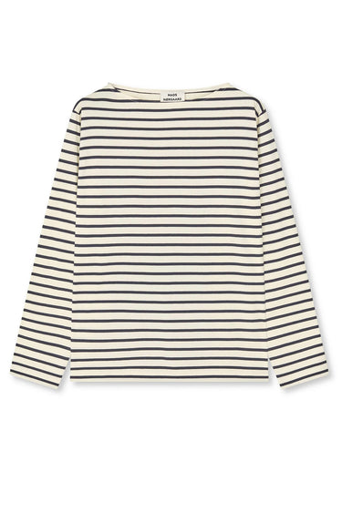 OBS! Fjernlager. Levering kan blive forlænget med 2-3 dage, hvis varen ikke findes i vores butik lige nu.Klassisk langærmet tee fra Mads Nørgaard med lange ærmer og bådudskæring i halsen.