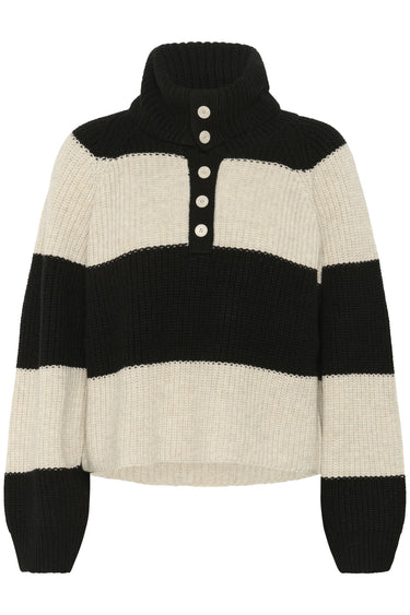 OBS! Fjernlager. Levering kan blive forlænget med 2-3 dage, hvis varen ikke findes i vores butik lige nu.Super lækker strik fra Part Two med lange ærmer, høj hals med knaplukning over brystet og smarte brede striber.