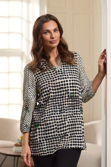- Flot tunika fra 2-Biz med ¾ lange ærmer, rund hals med v-udskæring og en fin krave samt et skønt prikket print.