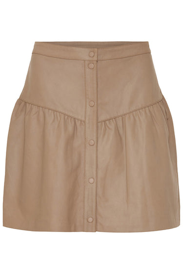 OBS! Fjernlager. Levering kan blive forlænget med 2-3 dage, hvis varen ikke findes i vores butik lige nu.Kort nederdel fra Notyz i en blød og lækker skindkvalitet.Nederdelen har også et feminin snit, rynkeeffekter omkring hofterne og trykknapper langs fronten.