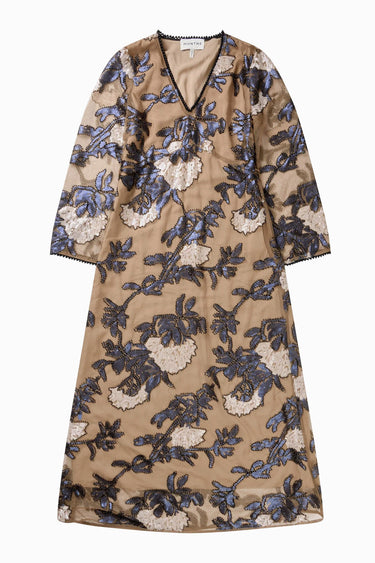 OBS! Fjernlager. Levering kan blive forlænget med 2-3 dage, hvis varen ikke findes i vores butik lige nu.En smuk kjole fra Munthe med et all-over perle og paillet blomster broderi. Kjolen har elegante sorte perler langs kanterne af den smukke v-hals, samt ved afslutningen af ærmerne. Denne kjole er designet med en aftagelig underkjole for at skabe flere styling muligheder.