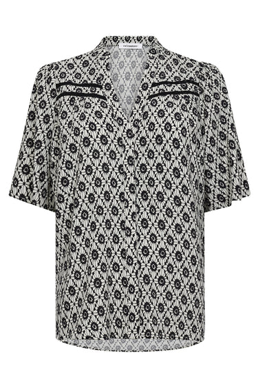 OBS! Fjernlager. Levering kan blive forlænget med 2-3 dage, hvis varen ikke findes i vores butik lige nu.Fin skjorte fra Co'couture med korte ærmer, v-udskæring i halsen og skjult knaplukning langs fronten.Skjorten har også et fint print og en afslappet silhuet.