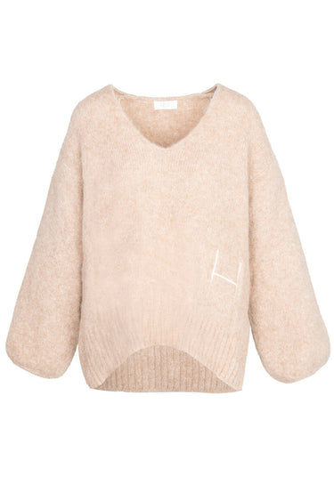 Blød og lækker strik fra Hést med lange pufærmer, v-udskæring i halsen og en løs silhuet.Strikken har også en lækker kvalitet og en fin broderet detalje i siden.