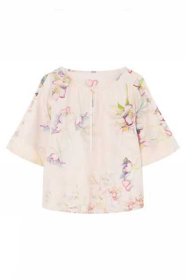 - OBS! Fjernlager. Levering kan blive forlænget med 2-3 dage, hvis varen ikke findes i vores butik lige nu.Super fin skjortebluse fra Gustav med ½ lange brede ærmer, båd- og v-udskæring i halsen og det flotteste maleriske blomsterprint.