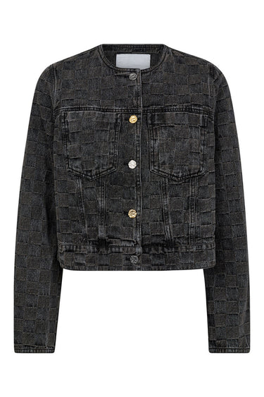 OBS! Fjernlager. Levering kan blive forlænget med 2-3 dage, hvis varen ikke findes i vores butik lige nu.Cropped denim jakke fra Haute L'amitié med lange ærmer, rund hals og store lommer på brystet.