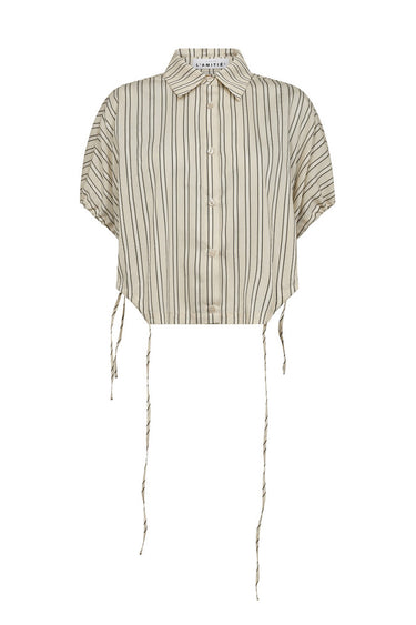 - OBS! Fjernlager. Levering kan blive forlænget med 2-3 dage, hvis varen ikke findes i vores butik lige nu.Smart skjortetop fra Haute L'Amitíe med korte ærmer, krave i halsen og knaplukning langs fronten.Toppen har også et klassisk stribet print og fine bindesnore i bunden.