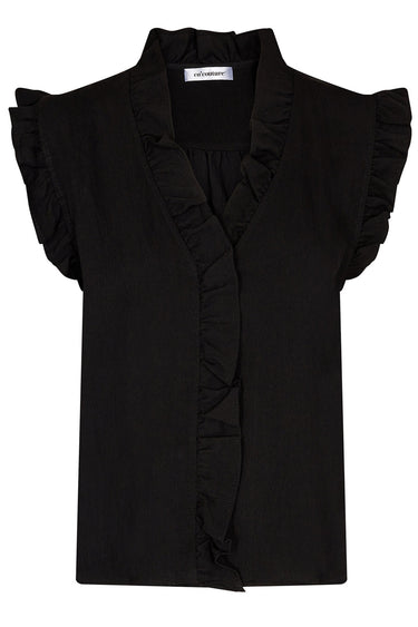 OBS! Fjernlager. Levering kan blive forlænget med 2-3 dage, hvis varen ikke findes i vores butik lige nu.Feminin top fra Co'couture med skønne flæsekanter omkring ærmerne, halsen og langs knappanelet i fronten.
