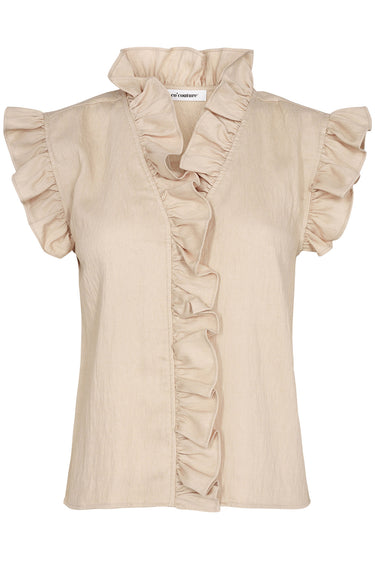 OBS! Fjernlager. Levering kan blive forlænget med 2-3 dage, hvis varen ikke findes i vores butik lige nu.Feminin top fra Co'couture med skønne flæsekanter omkring ærmerne, halsen og langs knappanelet i fronten.