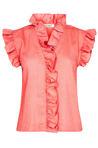 - OBS! Fjernlager. Levering kan blive forlænget med 2-3 dage, hvis varen ikke findes i vores butik lige nu.Feminin top fra Co'couture med skønne flæsekanter omkring ærmerne, halsen og langs knappanelet i fronten.