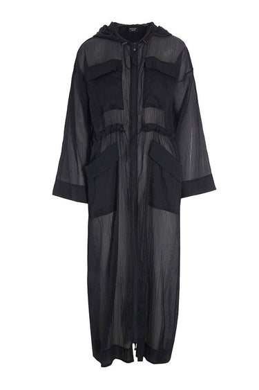 OBS! Fjernlager. Levering kan blive forlænget med 2-3 dage, hvis varen ikke findes i vores butik lige nu.Denne transparente kjole med hætte er med sine elastiksnore i hætten og ved taljen både sporty og elegant. Det florlette stof falder smukt og sofistikeret om kroppen. Brug kjolen med et kropsnært outfit under. Tag den over en anden kjole, eller lad et par jeans og en casual T-shirt danne kontrast til det fine stof.