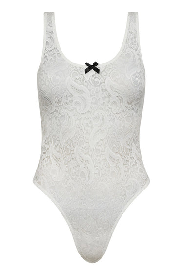 OBS! Fjernlager. Levering kan blive forlænget med 2-3 dage, hvis varen ikke findes i vores butik lige nu.Smuk blonde bodysuit fra Haute L'Amitié med brede skulderstropper, dyb udskæring i halsen og en fin lille sløjfe på brystet.