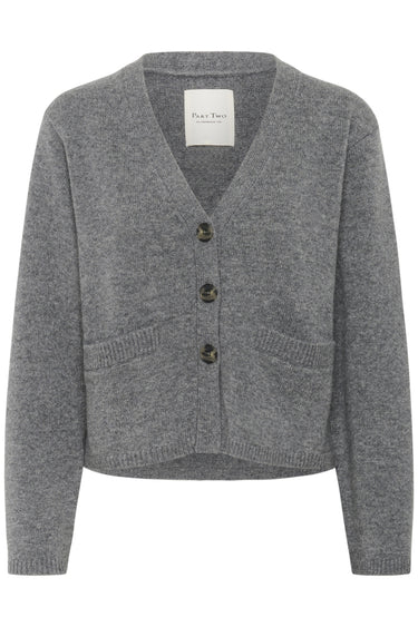 OBS! Fjernlager. Levering kan blive forlænget med 2-3 dage, hvis varen ikke findes i vores butik lige nu.Lækker enkel strik fra Part Two med lange ærmer, v-udskæring i halsen og knaplukning langs fronten.