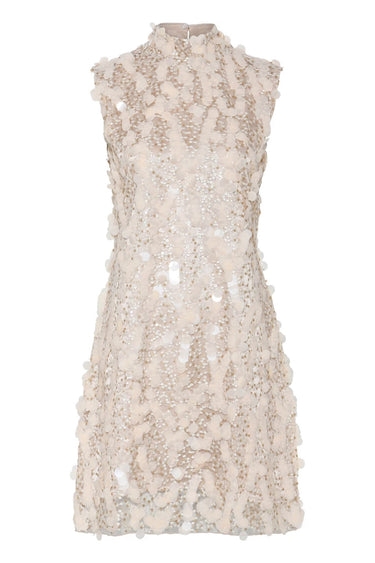OBS! Fjernlager. Levering kan blive forlænget med 2-3 dage, hvis varen ikke findes i vores butik lige nu.Den smukkeste ærmeløse pailletkjole fra Bruuns Bazaar med høj hals, fast talje og let udstrakt nederdel. Kjolen er beklædt med store, matte og skinnende pailletter, der skaber tekstur og dybde i designet.