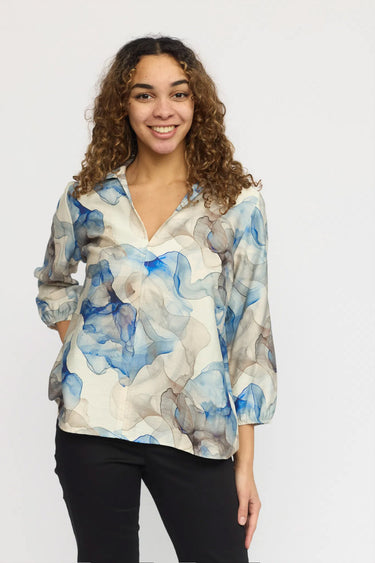 - OBS! Fjernlager. Levering kan blive forlænget med 2-3 dage, hvis varen ikke findes i vores butik lige nu.Elegant bluse fra 2-Biz med ¾ lange ærmer, v-udskæring med en lille krave i halsen og et smukt abstrakt print.