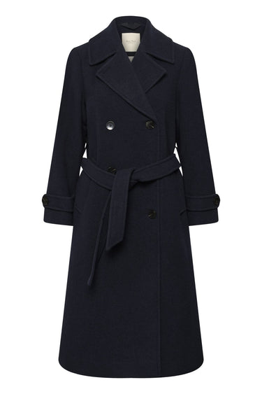OBS! Fjernlager. Levering kan blive forlænget med 2-3 dage, hvis varen ikke findes i vores butik lige nu.Klassisk frakke fra Part Two med lange ærmer, en bred krave i halsen og et bredt bindebælte i taljen.Frakken har også fine remme omkring ærmerne og store knapper langs fronten.