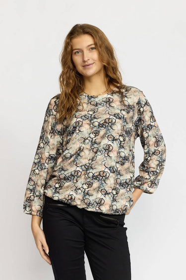 - OBS! Fjernlager. Levering kan blive forlænget med 2-3 dage, hvis varen ikke findes i vores butik lige nu.Flot bluse fra 2-Biz lange ærmer, rund hals og et fint print.