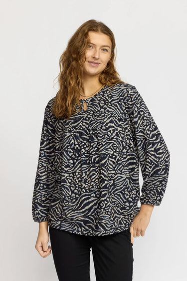 - OBS! Fjernlager. Levering kan blive forlænget med 2-3 dage, hvis varen ikke findes i vores butik lige nu.Flot bluse fra 2-Biz med ¾ lange ærmer, rund hals med en lille nøglehulsudskæring og et skønt print.