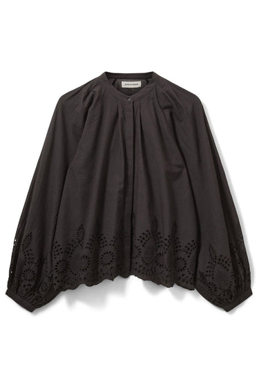 - OBS! Fjernlager. Levering kan blive forlænget med 2-3 dage, hvis varen ikke findes i vores butik lige nu.Feminin skjortebluse fra Sofie Schnoor med lange pufærmer, kinakrave i halsen og smukke broderet detaljer i bunden.