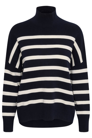 OBS! Fjernlager. Levering kan blive forlænget med 1-2 dage, hvis varen ikke findes i vores butik lige nu.Lækker strik fra InWear med lange ærmer og høj hals. Strikken har også en fantastisk dejlig kvalitet der falder smukt langs kroppen og et fint stribet mønster der står i flot kontrast til den neutrale baggrund.