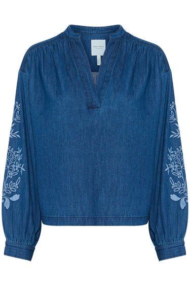 OBS! Fjernlager. Levering kan blive forlænget med 2-3 dage, hvis varen ikke findes i vores butik lige nu.Flot denim bluse fra Part Two med lange let puffede ærmer, kinakrave med v-udskæring i halsen og smukke broderet detaljer på ærmerne.