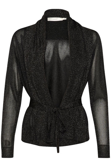 OBS! Fjernlager. Levering kan blive forlænget med 2-3 dage, hvis varen ikke findes i vores butik lige nu.Flot cardigan fra InWear med lange ærmer, bindebælte i taljen og en cropped længde. Cardiganen har også en skøn glimmerkvalitet.