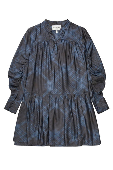 OBS! Fjernlager. Levering kan blive forlænget med 2-3 dage, hvis varen ikke findes i vores butik lige nu.Smuk kjole fra Munthe med lange pufærmer, v-udskæring i halsen og skønne detaljer.Kjolen har fine rynkeeffekter i ærmerne, tætsiddende manchetter og flæseeffekter i skørtet samt et abstrakt all-over print.