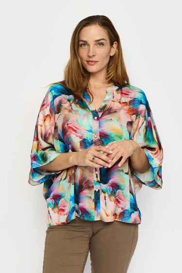 OBS! Fjernlager. Levering kan blive forlænget med 2-3 dage, hvis varen ikke findes i vores butik lige nu.Smuk farverig skjorte fra 2-Biz med ¾ lange ærmer, rund hals med v-udskæring i halsen og knaplukning langs fronten.