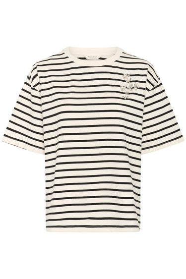 OBS! Fjernlager. Levering kan blive forlænget med 2-3 dage, hvis varen ikke findes i vores butik lige nu.Smart oversized tee fra Part Two med ½ lange ærmer, rund hals og smukke sten på brystet i form af en lille blomst.